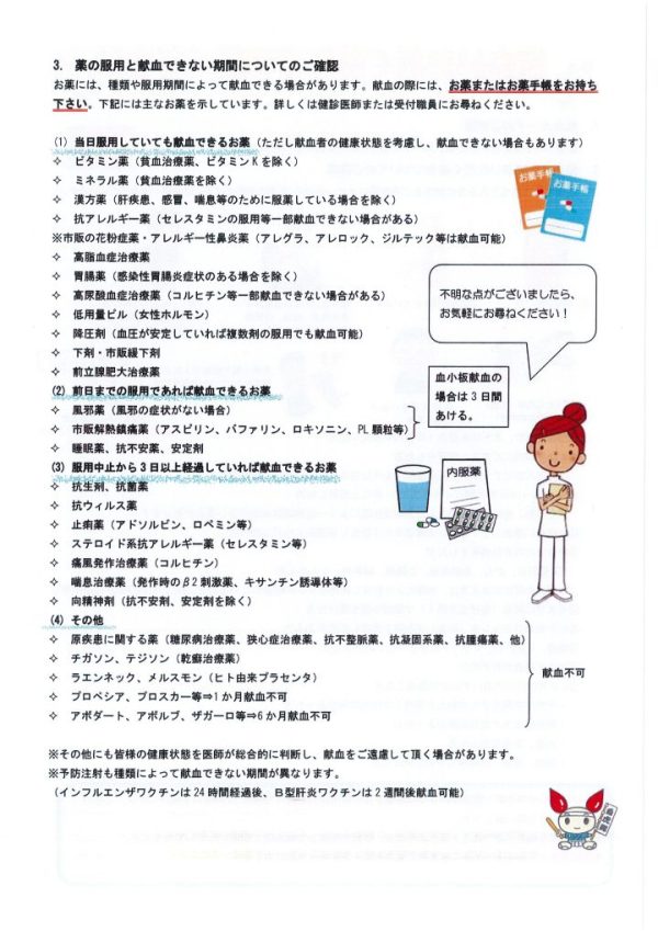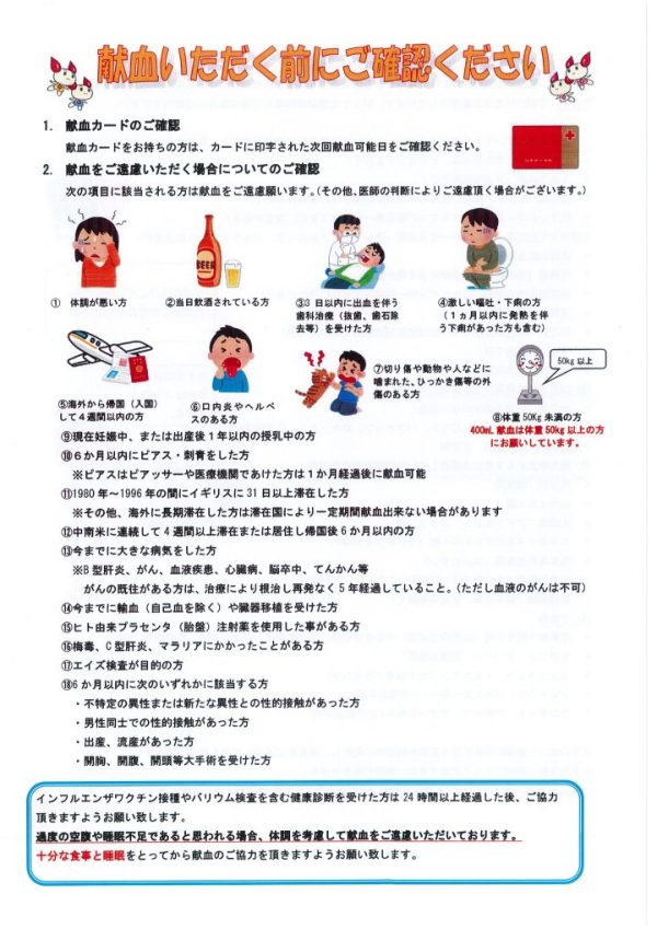 その他 ①採血時に運転免許証などの身分証明書又は、献血カードをお持ちになってください。