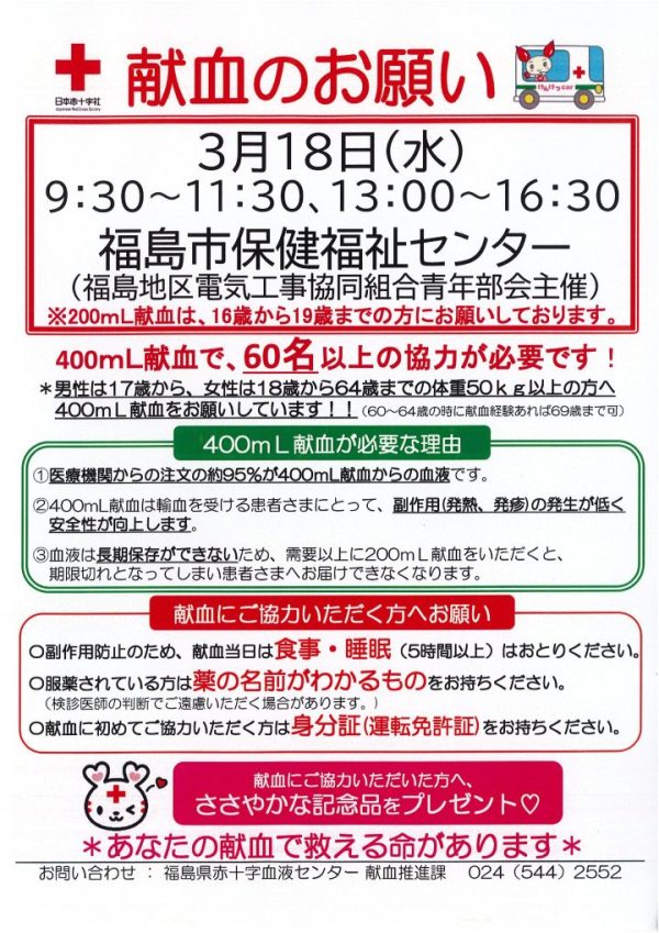 そこで、当組合の社会貢献の一環として福島赤十字血液センター様、福島市様のご協力の下、福島地区電気工事協同組合青年部会主催の令和7年度集団献血活動を開催いたします。