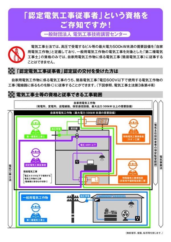 先般、福島県電気工事工業組合を通して一般社団法人電気工事技術センターより、認定電気工事従事者資格について周知依頼文書が届きましたので、組合員皆様にご案内申し上げます。