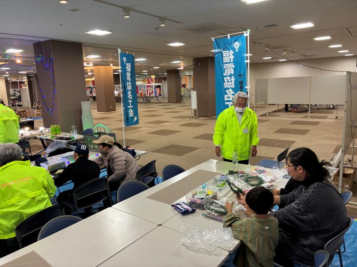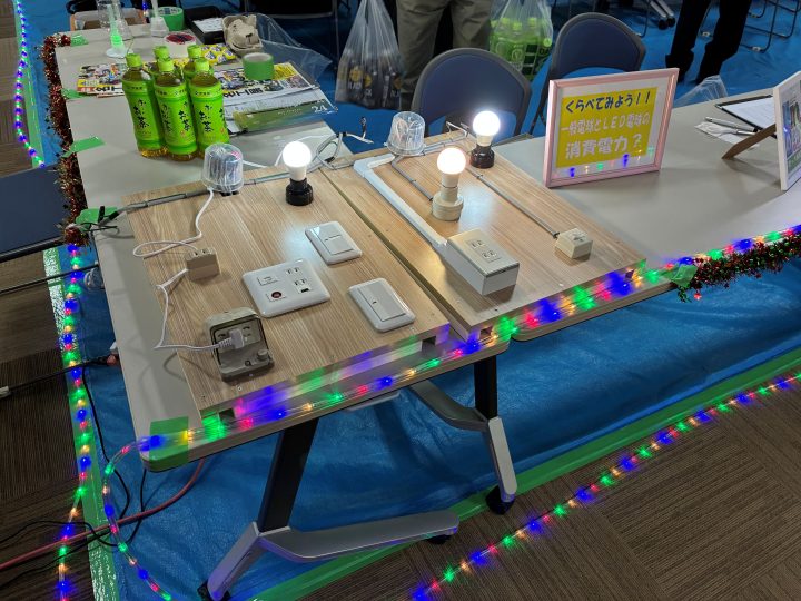 ブースでは毎年好評を博しているペットボトルと光ファイバーを用いた工作体験、イルミネーションライト付きクリスマスリース工作体験の他、手回し発電装置の展示、発電の仕組みのパネル展示、一般電球とLED電球の消費電力の違い展示を催した結果、来場者はトータル145名の盛況となりました。